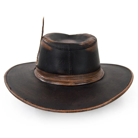 One-Off is a head turner, and so will you with this one of a kind hat. Part of the Aussie Collection from Bullhide by Monte Carlo, One-Off is made up of genuine dark brown leather, and features a 3 1/2" brim, and a twisted leather hat band with a feather and concho adorn to add that ruggedness.Material: Leather