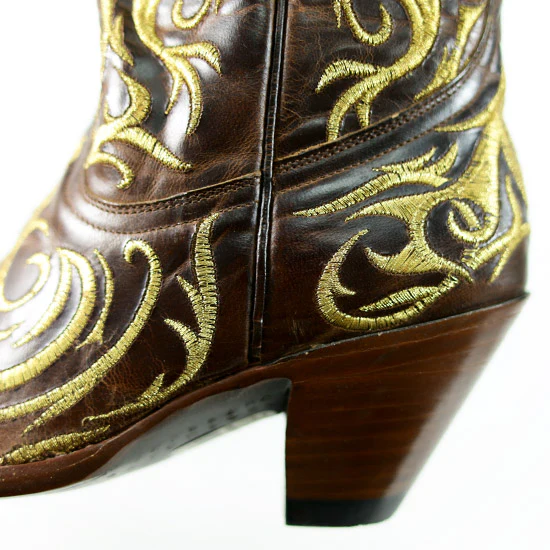 Women's "Madonna" tan distressed cowhide boots with extremely intricate gold stitching. leather outsoles.Leather: Cowhide